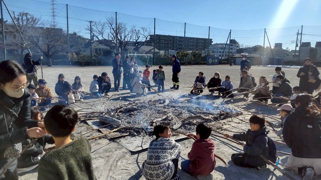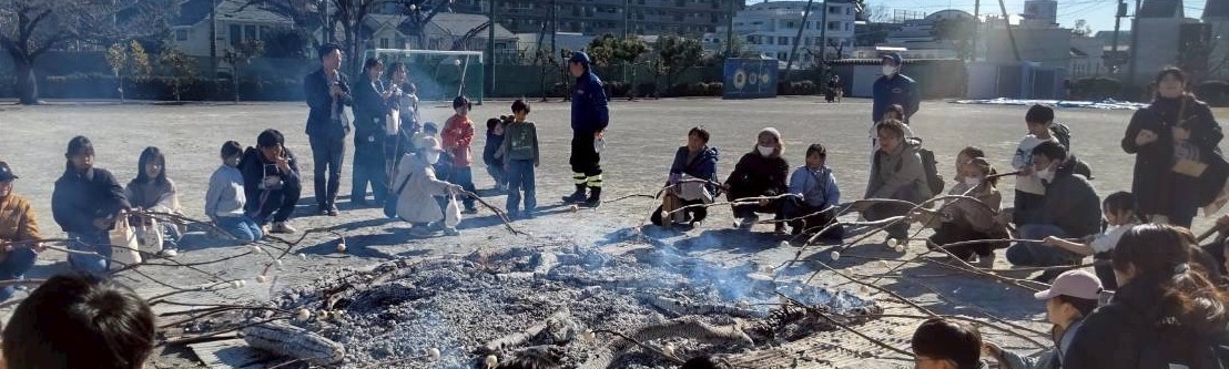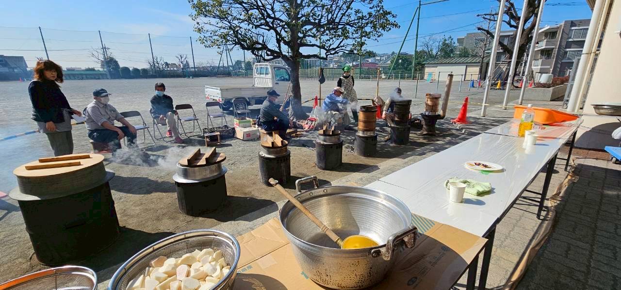 どんど焼きは毎年小正月の時期(1月15日頃)にお正月飾りなどをお焚き上げする日本の伝統行事です。以前はこの地域でも行われていました。青葉消防団第一分団第5班のご協力の下、校庭にやぐらを組んで燃やし、その後のおき火で枝に刺した団子を焼いて豚汁と一緒にいただきます。