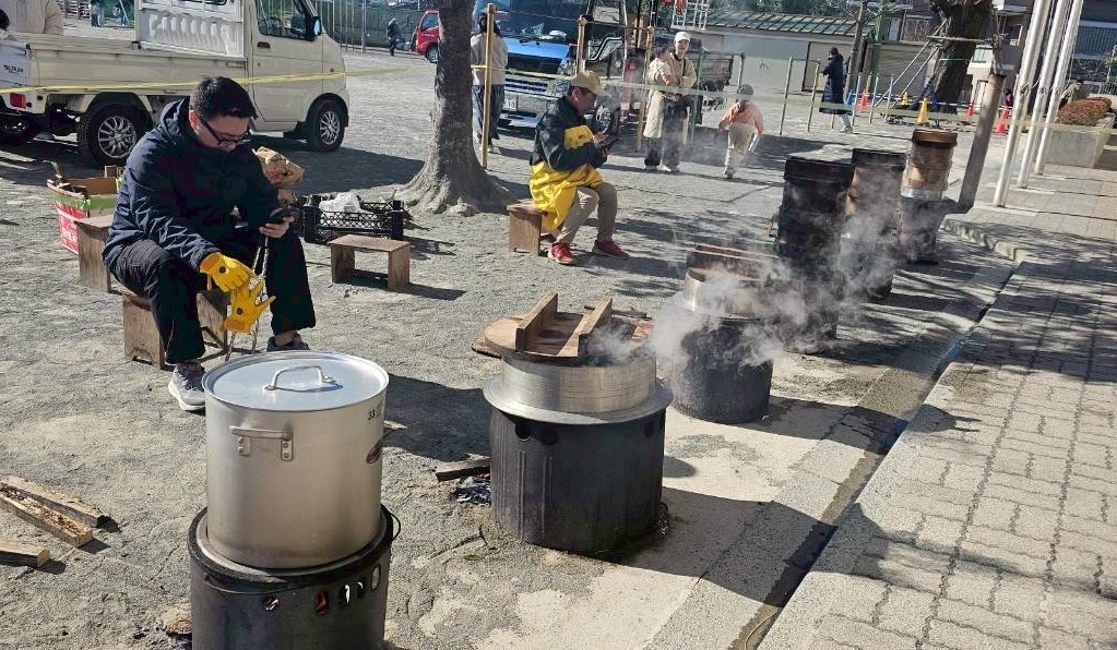 もちもちのお団子を串に刺し、無病息災を願ってやぐらの残り火で焼いて、豚汁と一緒にいただきました。