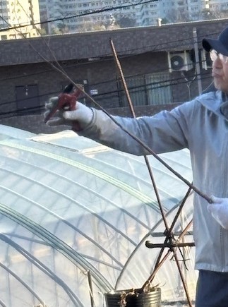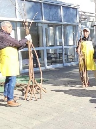 2025年1月13日(月)成人の日にどんど焼きを行いました。その準備として、前々日の11日に団子を刺す串を作りました。 木の枝を切り落とし、危なくないよう余分な枝を丁寧に削ぎ落して串を作ります。どんど焼き当日は大勢の方にご協力いただき、大きなやぐらを組み立てました。