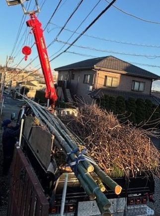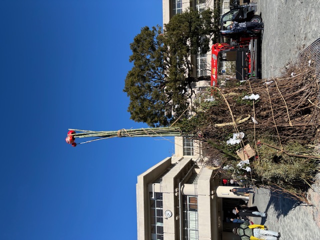 2025年1月13日(月)成人の日にどんど焼きを行いました。その準備として、前々日の11日に団子を刺す串を作りました。 木の枝を切り落とし、危なくないよう余分な枝を丁寧に削ぎ落して串を作ります。どんど焼き当日は大勢の方にご協力いただき、大きなやぐらを組み立てました。