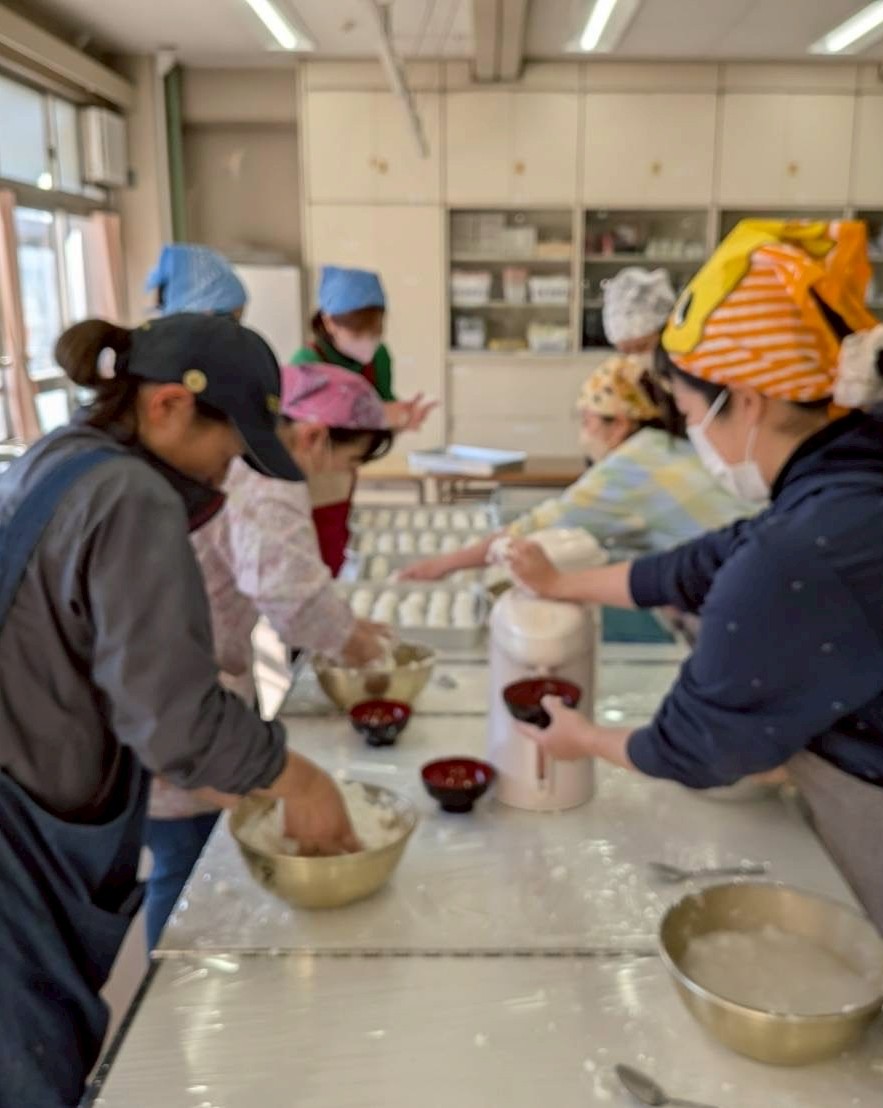 2025年3月1日に約140名が参加して餅つきを行いました。餅をつく威勢のいい音がピロティに響き渡る中、つきたてのお餅と雑煮を味わいました。5,6年生の希望者は杵を持って餅つきを体験しました。